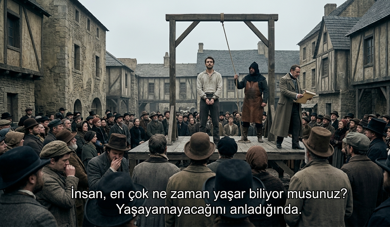 Avluda toplanan kalabalık sessizdi. Gökyüzü griydi; ne yağmur yağıyor ne de güneş kendini gösteriyordu. Sanki hava bile ne yapacağını bilemiyordu. Tahta sehpa, meydanın ortasında dimdik duruyor, etrafındaki insanlara soğuk bir gerçekliği hatırlatıyordu.