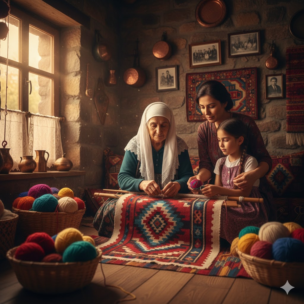 Kadınlar acılarını saklamaz; halının desenine işler. Böylece anı, evin en görünür yerinde durur — sessiz ama diri.